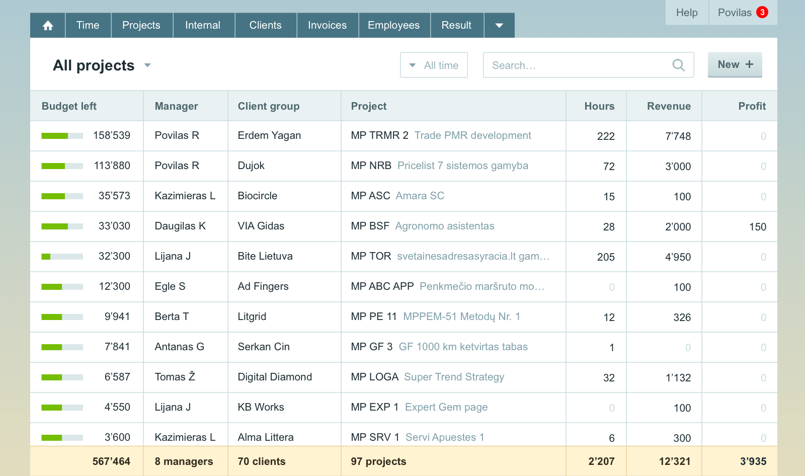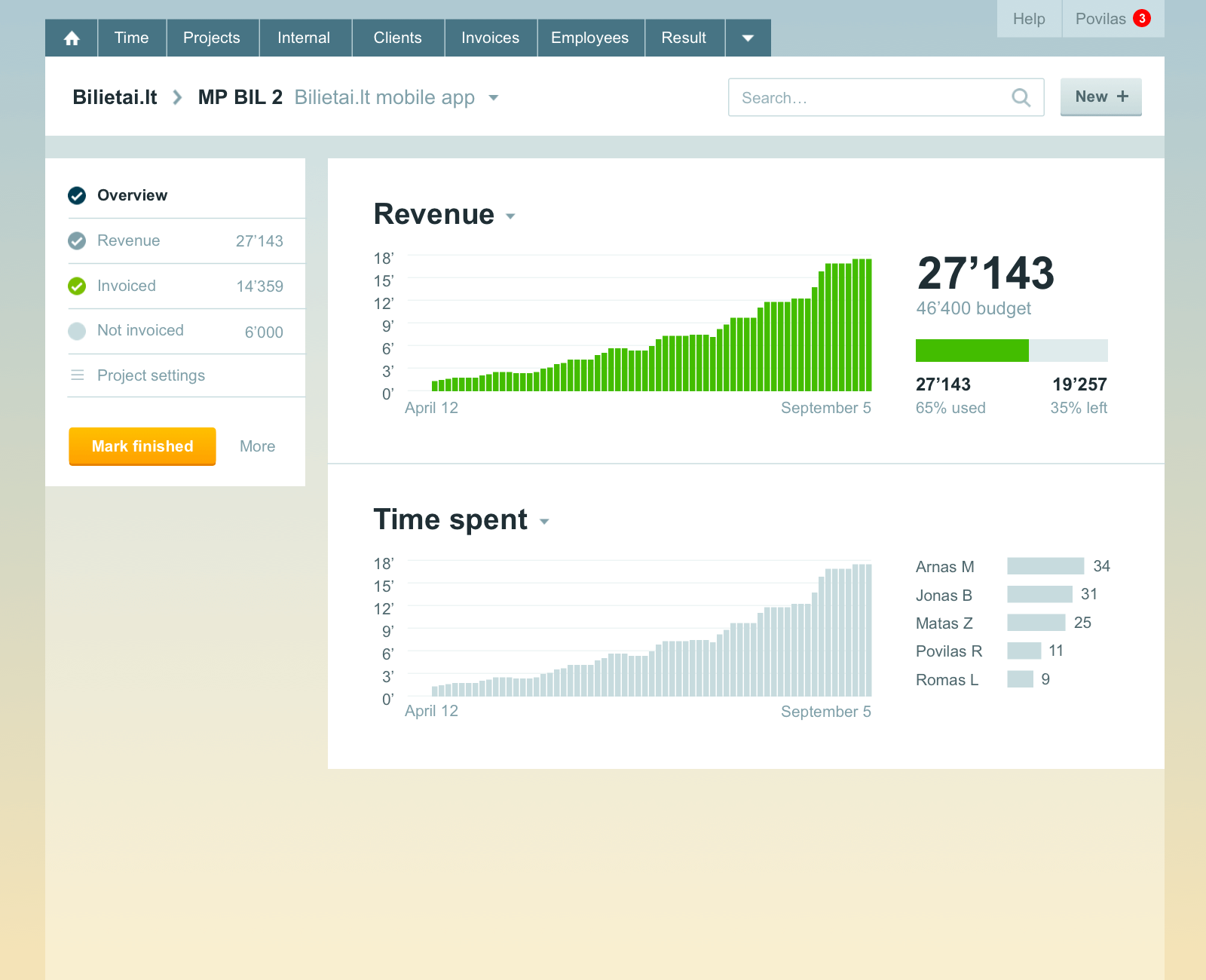 Set hourly or manual budgets to track the progress of your project and get notifications when you’re about to reach the budget limit.